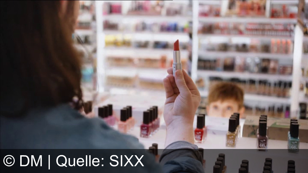 Eine Person hält einen roten Lippenstift hoch. Im Hintergrund stehen viele Nagellackfläschchen in verschiedenen Farben auf Regalen. Ein Kind schaut über den Tisch aus dem Hintergrund hervor. Die Umgebung erinnert an einen Kosmetikladen mit vielen Produkten auf Regalen.