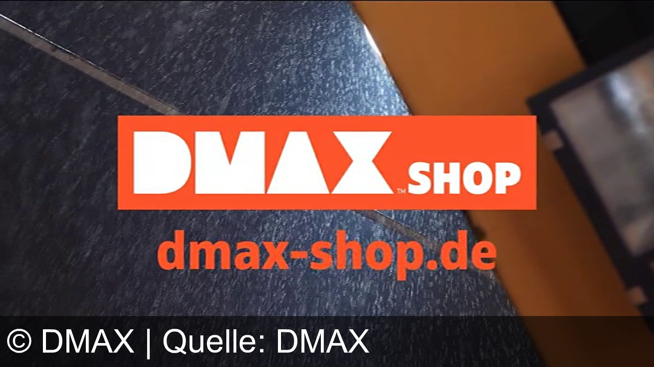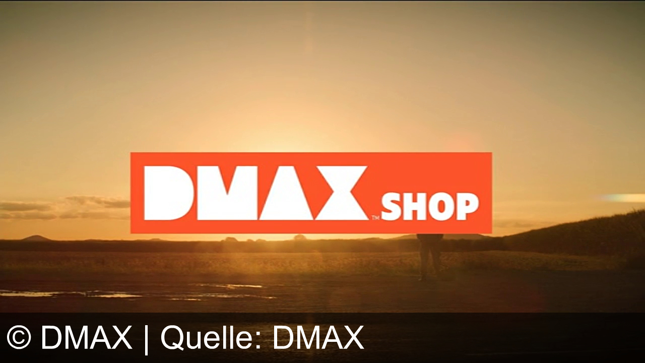 Ein großes orangefarbenes Banner mit der Aufschrift "DMAX SHOP" in weißen Buchstaben. Darunter steht "dmax-shop.de" in orange. Der Hintergrund zeigt ein dunkles, strukturiertes Muster.