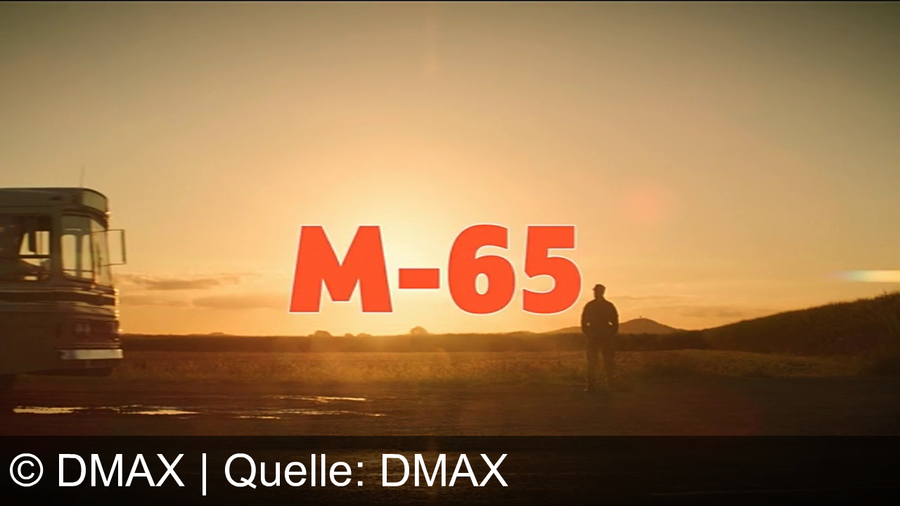 Eine Landschaft bei Sonnenuntergang. Ein Bus links, eine stehende Person rechts. Im Vordergrund steht groß "M-65" in roten Buchstaben.