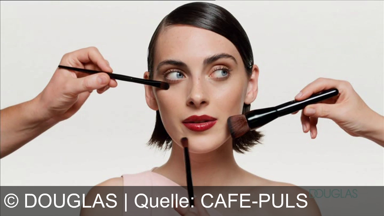 Eine Frau mit rotem Lippenstift wird von drei Händen mit Make-up-Pinseln geschminkt. Ihr Blick ist leicht abgewandt. Sie trägt ein schulterfreies, rosa Oberteil. Im unteren Bereich steht „DOUGLAS“ in grüner Schrift auf hellem Hintergrund.