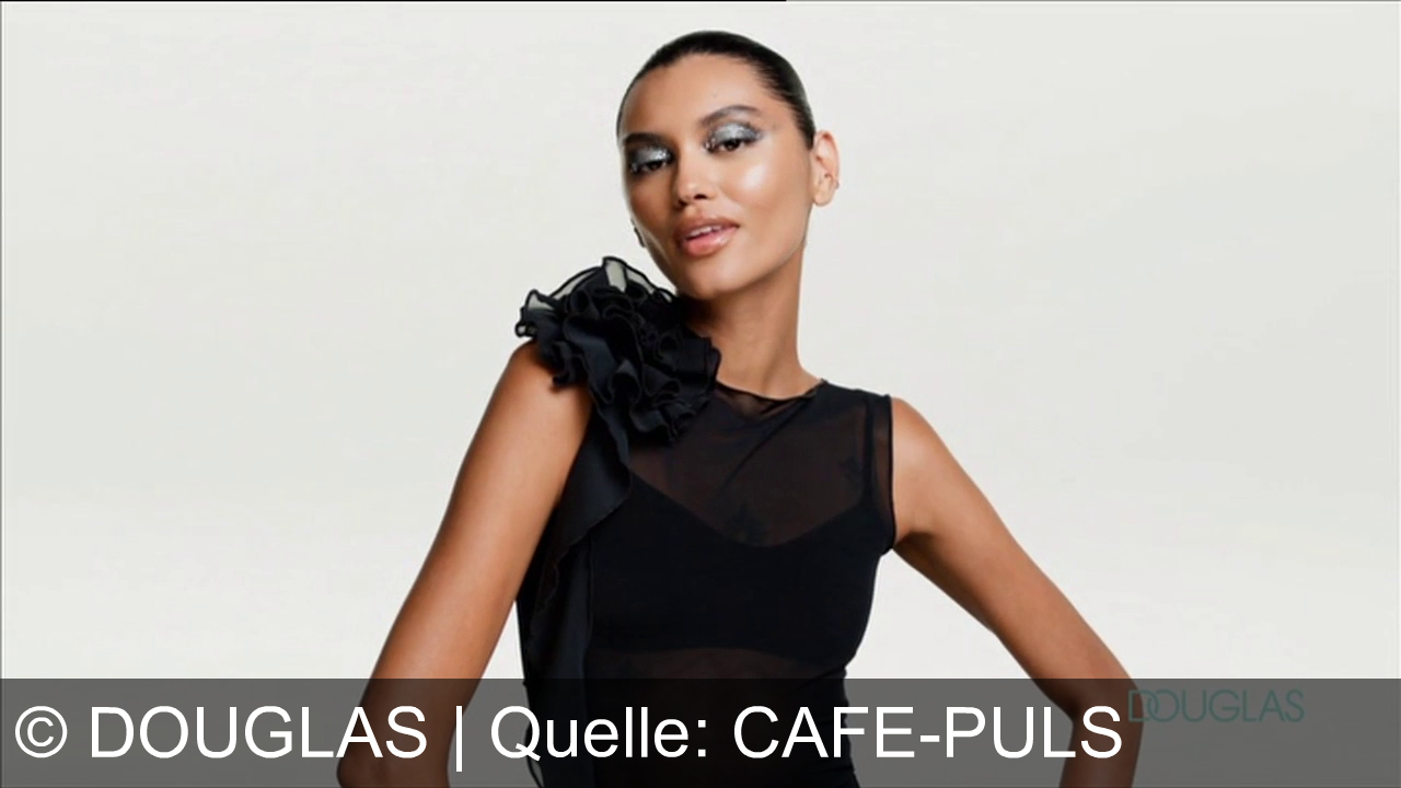 Eine Frau trägt ein schwarzes, durchsichtiges Oberteil mit einer großen Stoffblume an der Schulter. Ihr Make-up ist auffällig mit glänzenden Lidschatten. Im unteren Eck steht "Douglas". Der Hintergrund ist schlicht und hell.