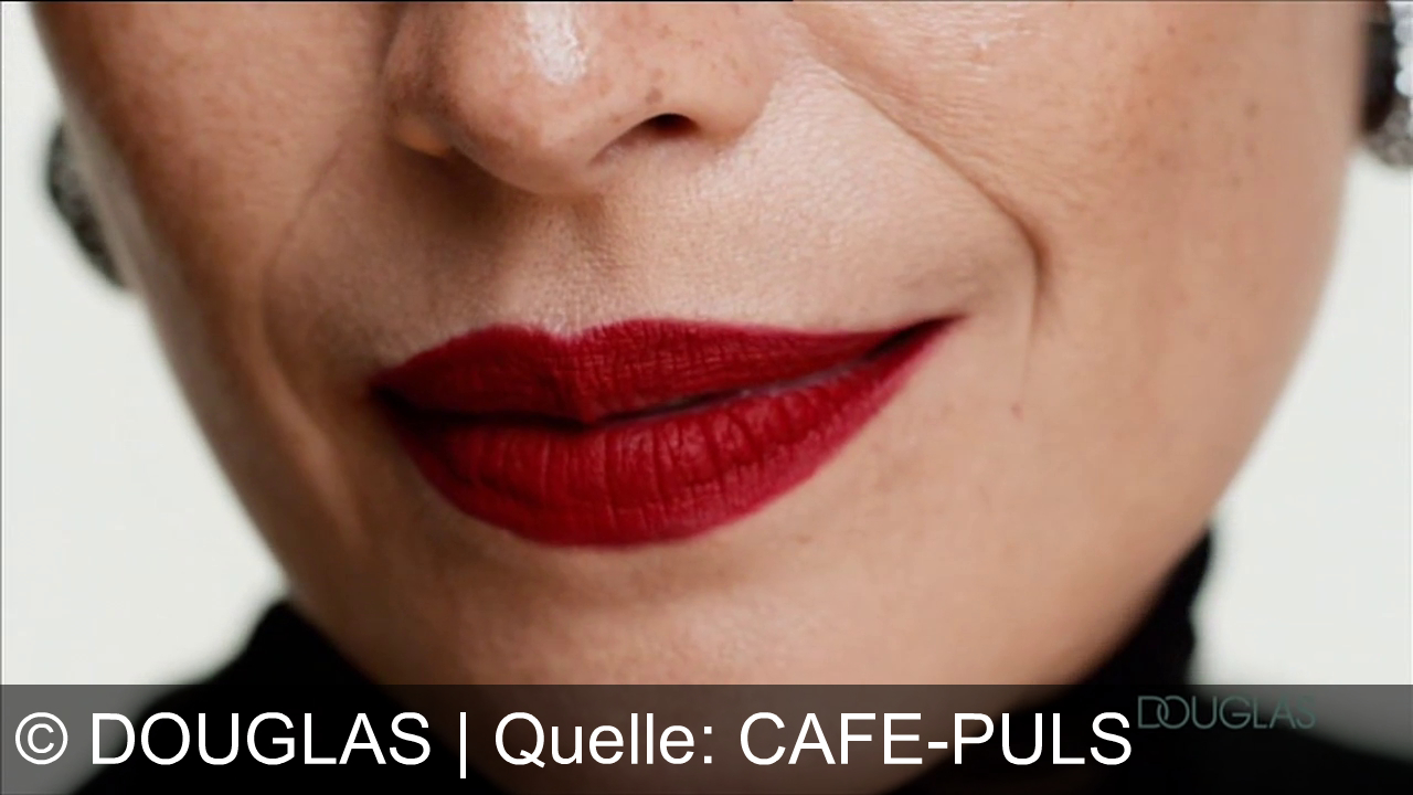 Nahaufnahme eines Gesichts mit roten Lippen. Unten rechts das Logo von Douglas.