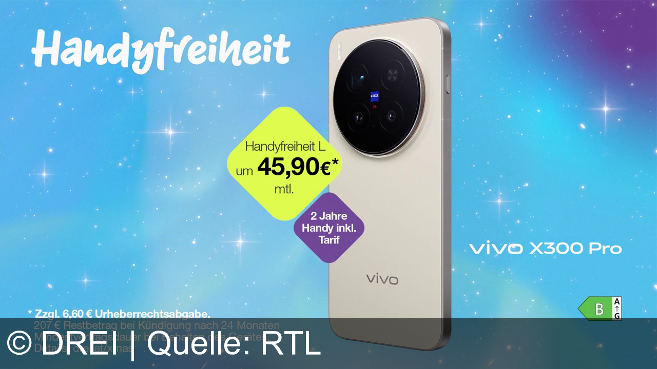 Ein Smartphone-Modell "Vivo X300 Pro" vor einem blauen, sternenartigen Hintergrund. Text: "Handyfreiheit" mit Angebot "Handyfreiheit L" für 45,90€ monatlich, beinhaltet 2 Jahre Handy inkl. Tarif. Kleingedrucktes zur Urheberrechtsabgabe und Vertragsdetails. Energieetikett „B“ unten rechts.