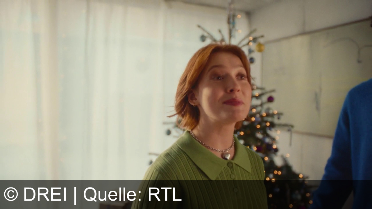 Eine Frau mit rotem Haar trägt einen grünen Pullover und eine Perlenkette. Im Hintergrund steht ein geschmückter Weihnachtsbaum. Ein Mann in Blau ist teilweise zu sehen. Die Szene wirkt festlich und leuchtend.