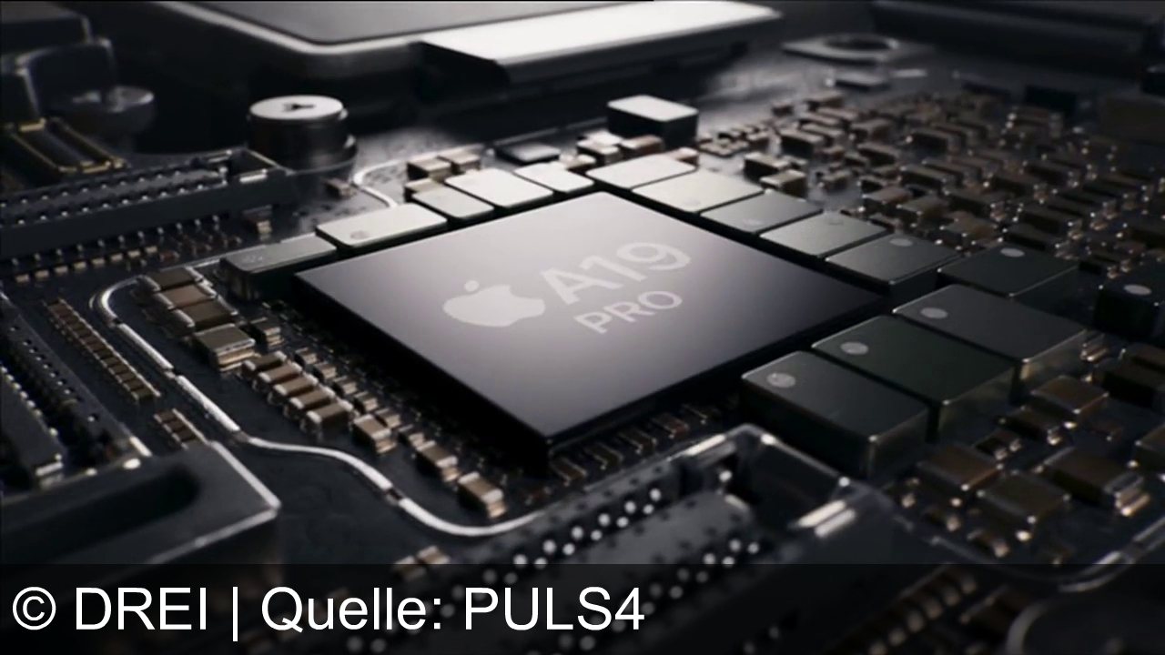 Nahaufnahme eines Computerchips auf einer Platine. Auf dem Chip steht "A19 PRO" mit einem Apple-Logo. Die Platine hat viele elektronische Komponenten wie Kondensatoren und Leitungen.