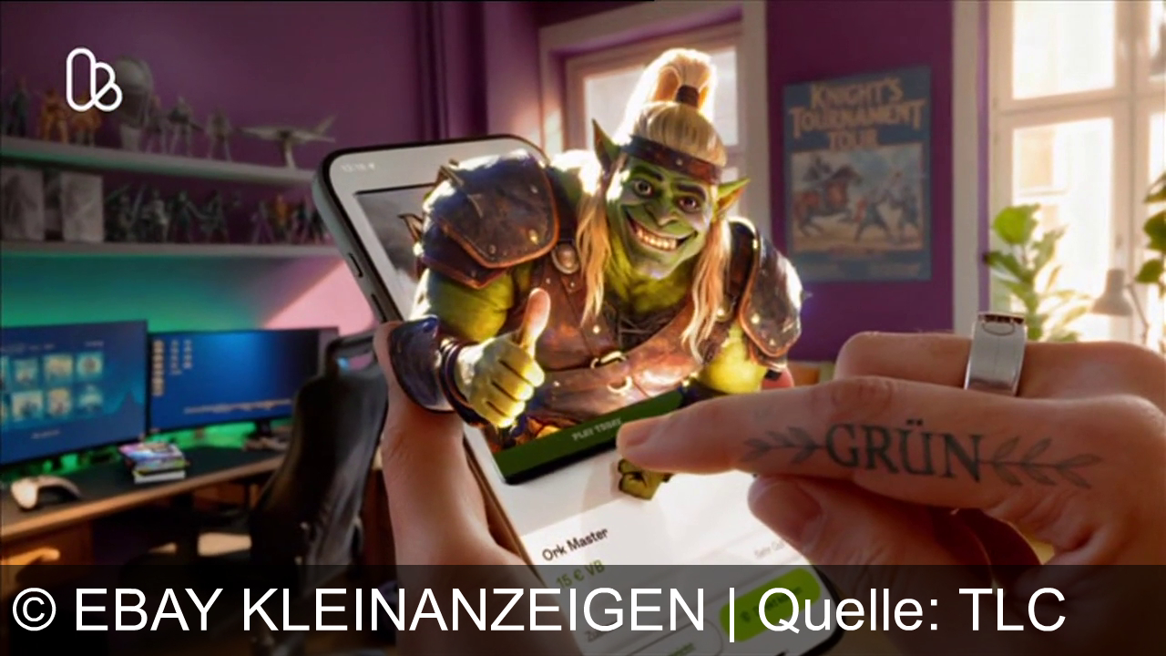 Ein grüner Ork mit Daumen hoch erscheint auf einem Smartphone-Bildschirm in einem Zimmer mit Lila Wänden. Eine Hand mit "GRÜN" tätowiert tippt auf den Bildschirm. Im Hintergrund ein Schreibtisch mit zwei Monitoren, eine Gaming-Stuhl und Regale mit Figuren. Ein Poster mit "Knight's Tournament Tour" hängt an der Wand.