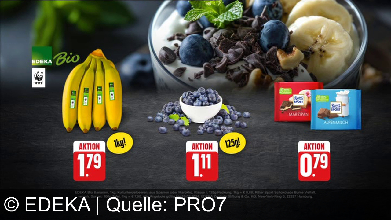 EDEKA bewirbt eine große Auswahl an frischem Obst und Gemüse sowie attraktive Aktionspreise, z. B. für Bio-Bananen, Heidelbeeren und Ritter Sport Schokolade. Die Werbebotschaft: Vielfalt, Frische und preiswerte Angebote gibt es bei EDEKA jederzeit.