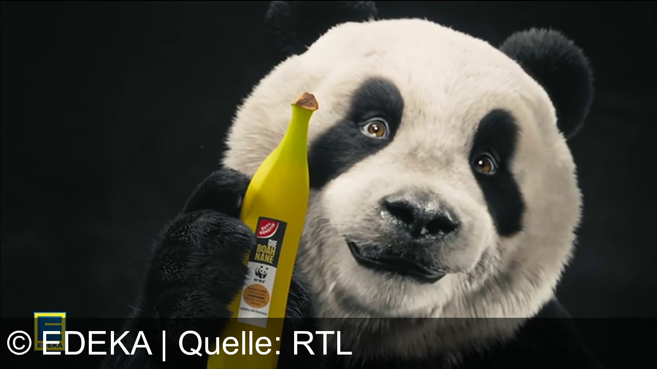 Ein Panda hält eine gelbe Flasche, die wie eine Banane geformt ist. Auf der Flasche steht "Die Boah Nane", und sie hat ein Etikett mit einem WWF-Logo. Unten links ist das EDEKA-Logo zu sehen. Der Hintergrund ist schwarz und der Panda schaut direkt nach vorne.