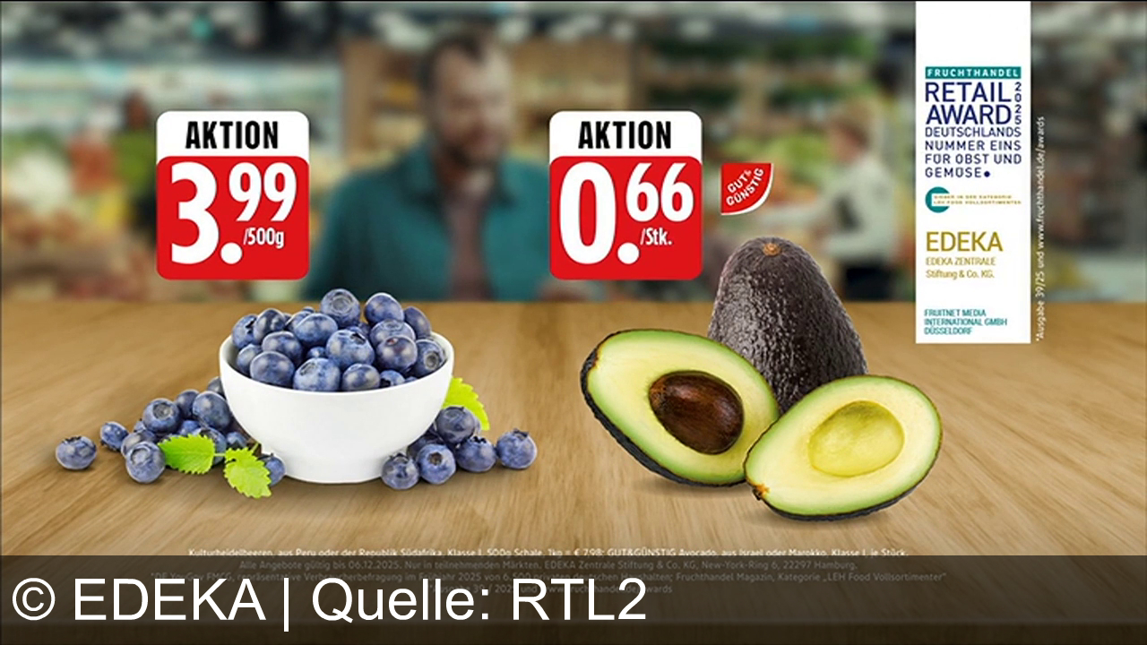 Werbung aus dem Jahr 2025 von Edeka in Österreich, mit dem von uns gewählten Titel: "Frische Heidelbeeren und günstige Avocados: Top-Qualität nur bei EDEKA – Wir lieben Lebensmittel" mit der Kurzbeschreibung: ""Alter? Nö, ganz frisch": Ganz Fresh Heidelbeeren und Gut & Günstig Avocados – frisch aus Deutschlands bester Obst- und Gemüseabteilung. Nur bei EDEKA. Wir lieben Lebensmittel.". Diese Werbung thematisiert oder beinhaltet die Kategorien Obst & Gemüse, Lebensmittel, Supermarkt.