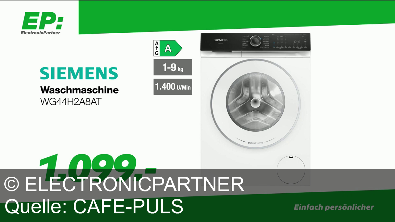 Siemens Waschmaschine WG44H2A8AT mit Energieklasse A. Füllmenge 1-9 kg, Schleuderdrehzahl 1.400 U/Min. Logo von EP: ElectronicPartner oben links. Preis 1.099 Euro. Grün-weißer Hintergrund, Schriftzug „Einfach persönlicher“ unten rechts.