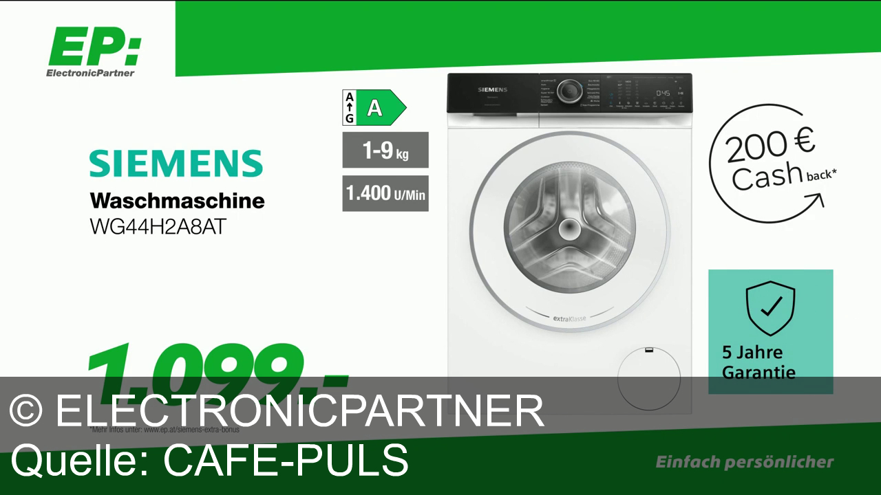 EP: ElectronicPartner-Werbung für Siemens Waschmaschine WG44H2A8AT. Waschmaschine schafft 1–9 kg, 1.400 U/Min, Energieeffizienzklasse A. Preis 1.099 Euro. 200 Euro Cashback geboten. 5 Jahre Garantie. Beschriftung unten: "Einfach persönlicher". Oben links Firmenlogo, rechts Vergünstigungsinformationen.