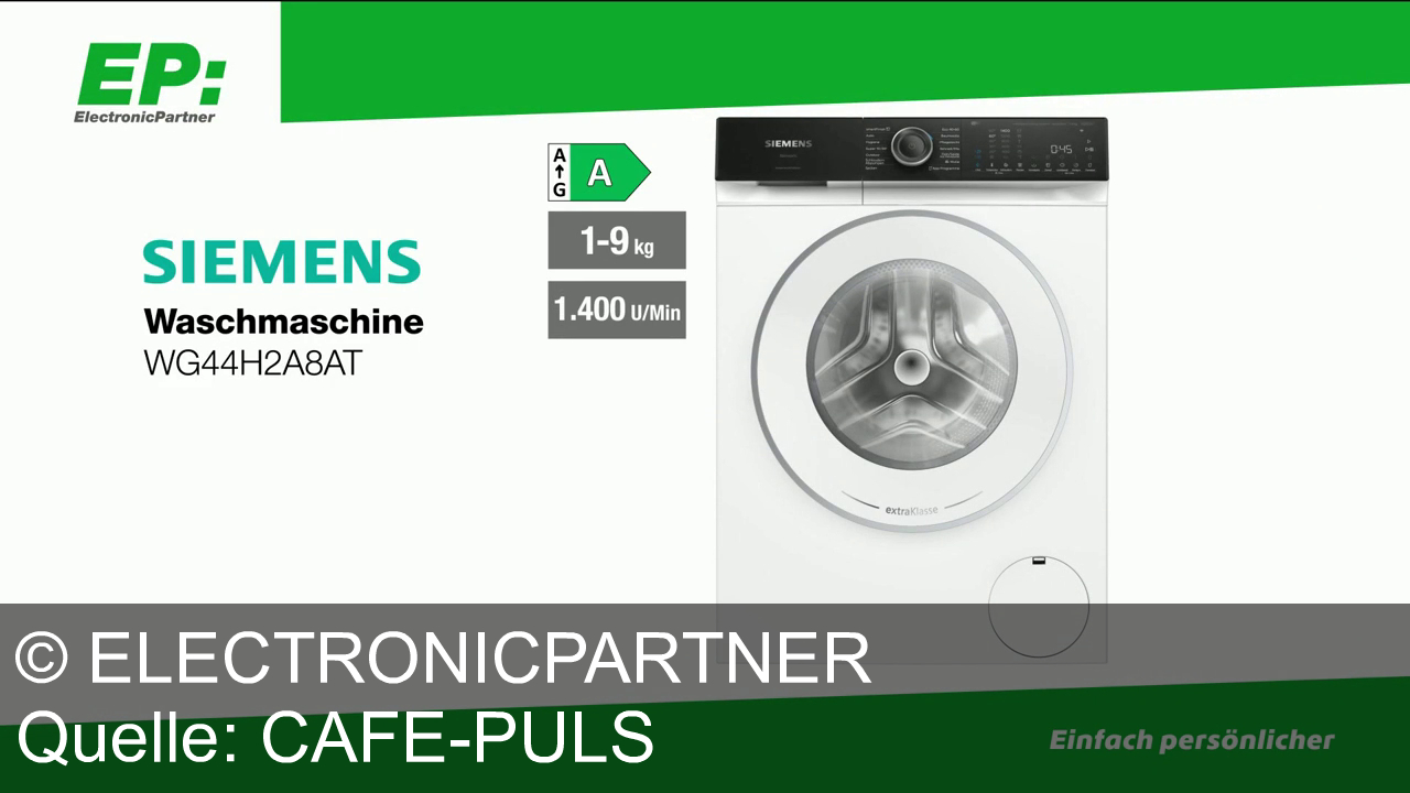 Eine Siemens Waschmaschine mit der Bezeichnung WG44H2A8AT. Energieeffizienzklasse A, Kapazität von 1-9 kg, 1400 Umdrehungen pro Minute. Das Logo von EP: ElectronicPartner und der Slogan „Einfach persönlicher“ befinden sich ebenfalls auf dem Bild.