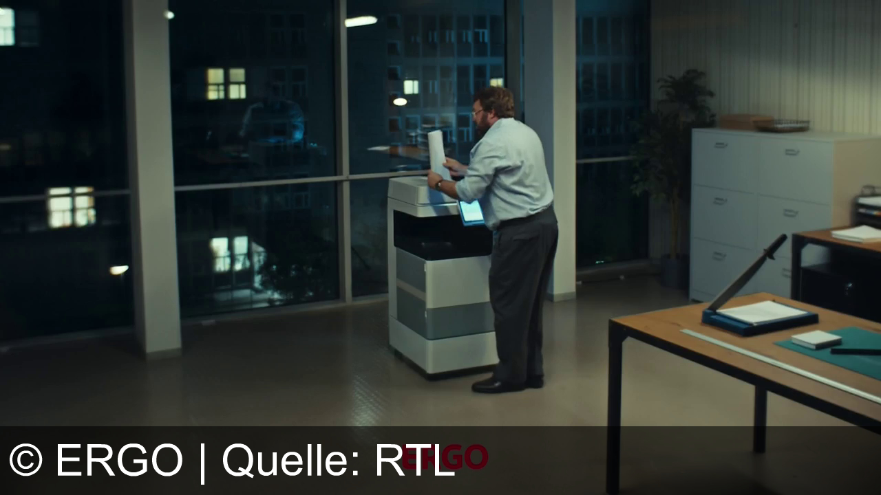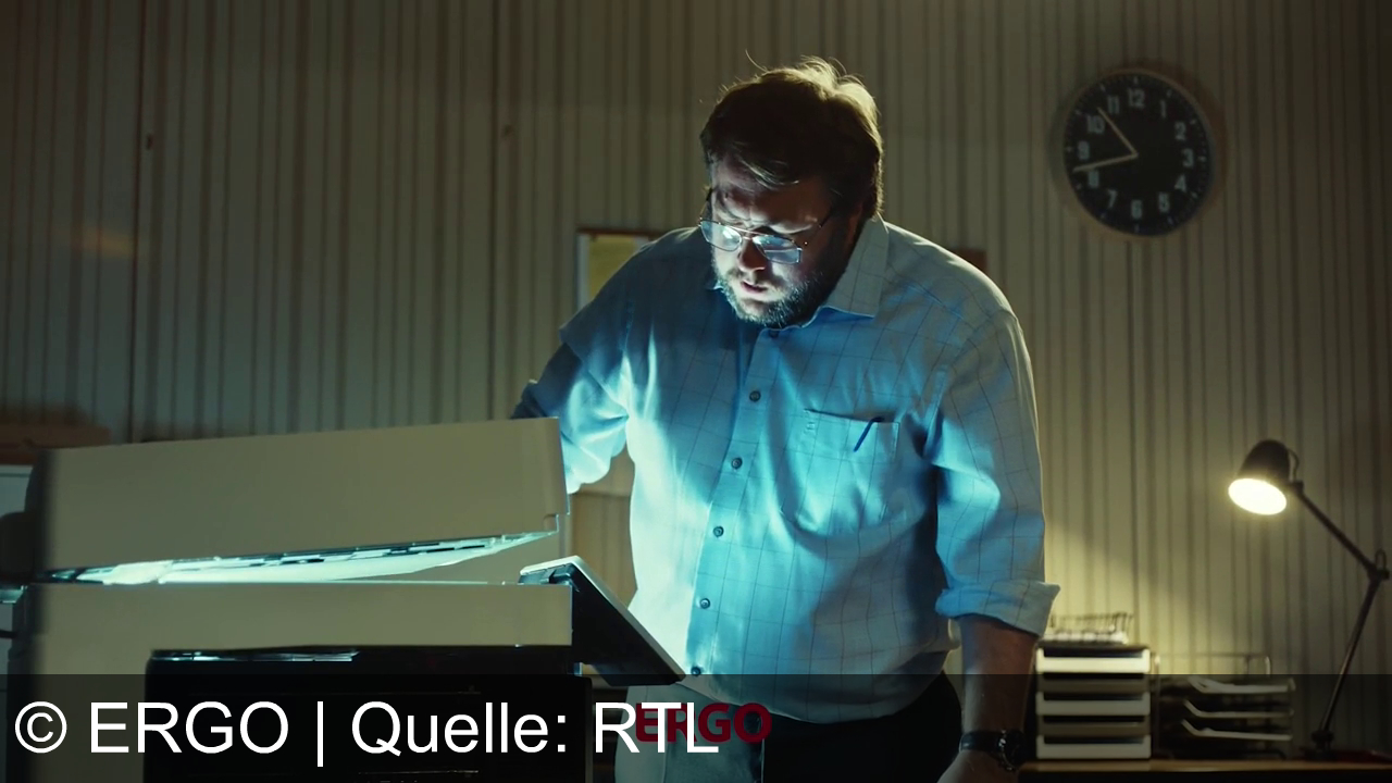 Ein Mann mit Brille und Bart steht in einem Büro neben einem Kopierer. Er trägt ein blaues Hemd und beugt sich über das Gerät. Im Hintergrund ist eine Wanduhr zu sehen, es ist abendliche Atmosphäre. Eine Lampe beleuchtet seinen Arbeitsplatz. Unten im Bild steht "ERGO" in roten Buchstaben.