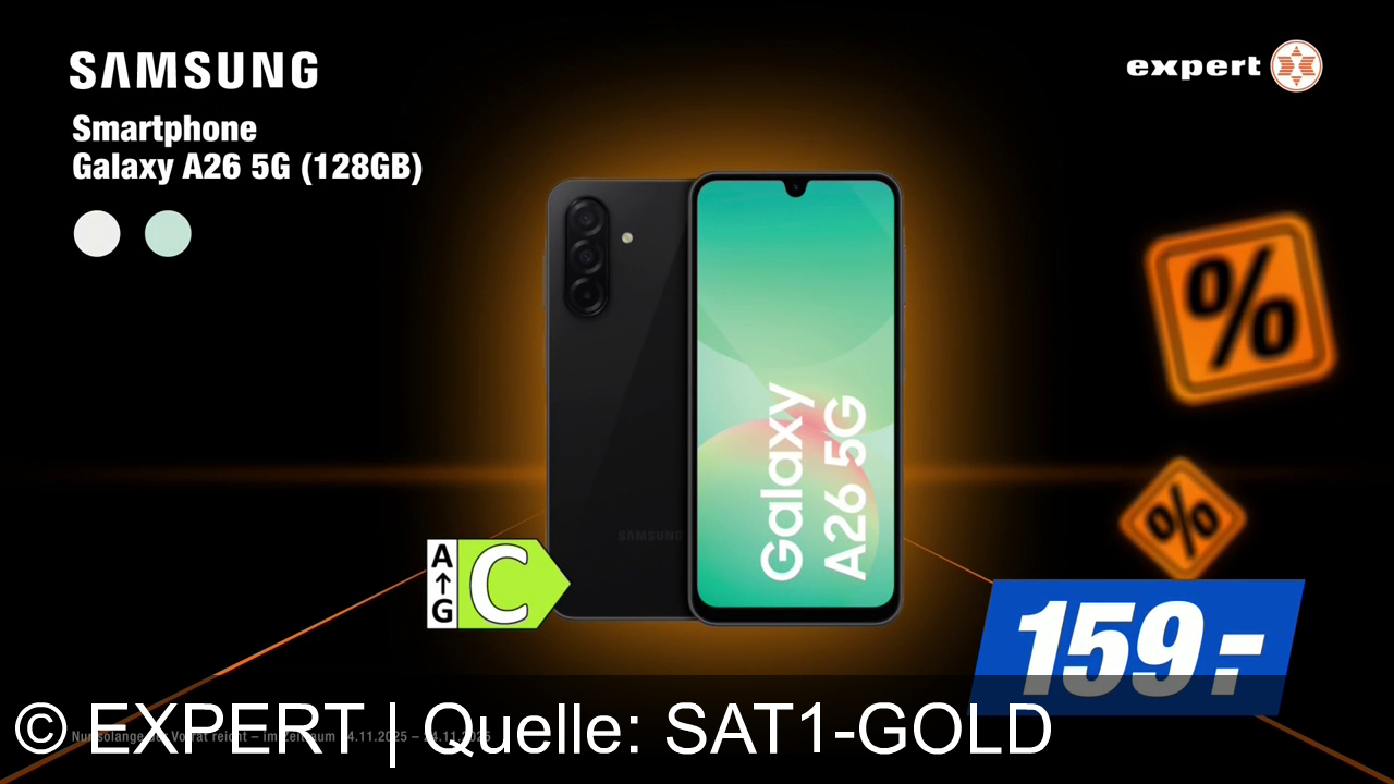 Samsung Galaxy A26 5G Smartphone mit 128GB wird beworben. Zwei Farboptionen sind verfügbar. Energieeffizienzklasse C. Preis beträgt 159 Euro. Verkaufszeitraum vom 14.11.2025 bis 24.11.2025. Angebot gilt solange der Vorrat reicht. Im Hintergrund sind Logos von Expert und Prozentzeichen.