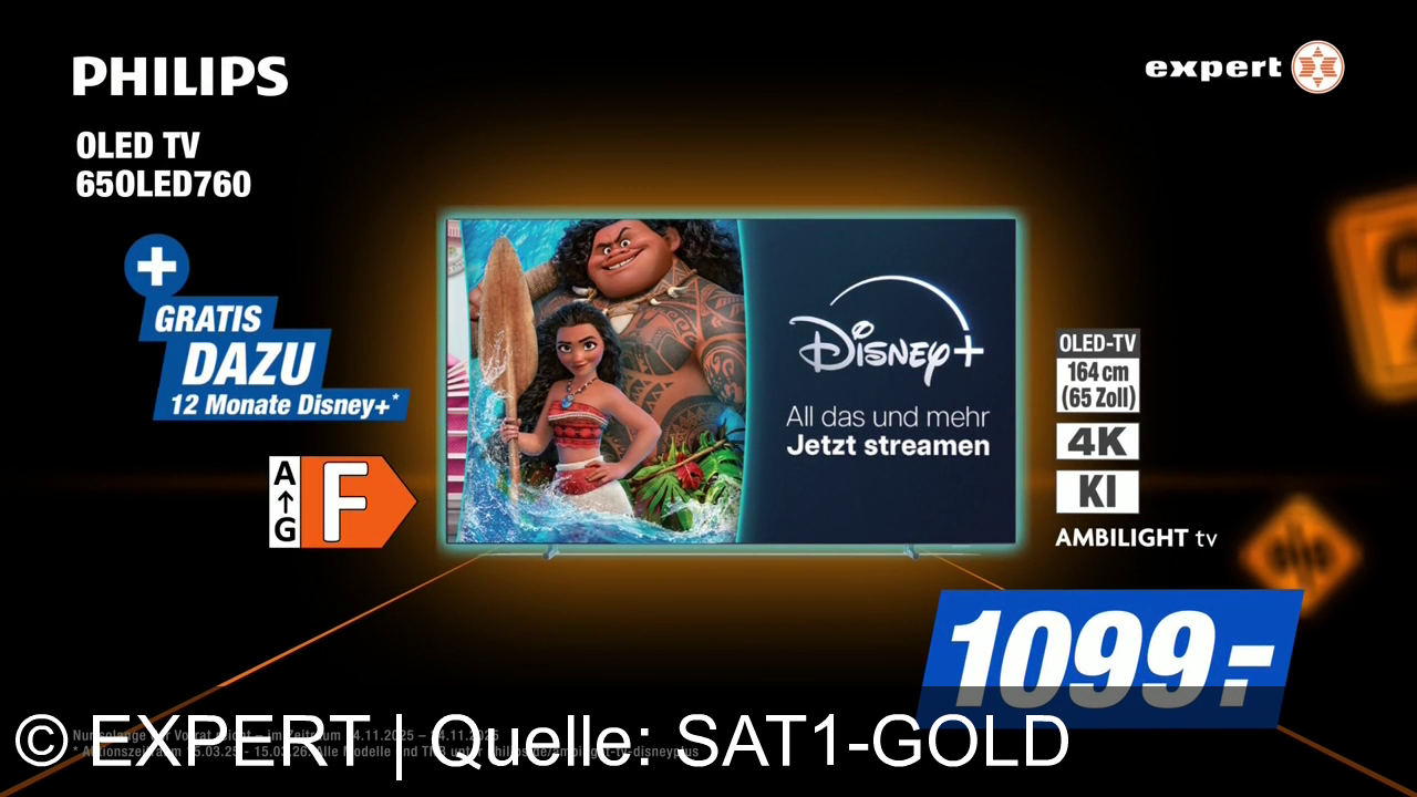 Philips OLED TV 65OLED760 wird beworben. Gratis 12 Monate Disney+ inklusive. 164 cm (65 Zoll) 4K OLED-TV mit Ambilight. Energieeffizienz F. Preis: 1.099 Euro. Hinweise zur Aktionszeit und Verfügbarkeit. Links im Bild zwei animierte Figuren, rechts Disney+ Logo mit "Jetzt streamen". Oben links "Philips", oben rechts "expert" Logo.