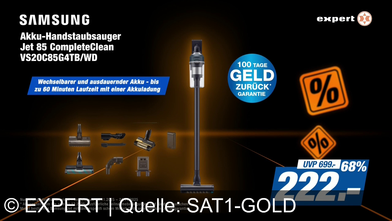 Samsung Akku-Handstaubsauger mit Modellnamen Jet 85 CompleteClean. Austauschbarer Akku, bis zu 60 Minuten Laufzeit. Zubehörteile abgebildet. 100 Tage Geld-zurück-Garantie. Expert-Logo oben rechts. Rabattanzeige mit UVP 699, Preis 222 nach 68% Rabatt. Text mit Aktionszeitraum und Bedingungen unten.