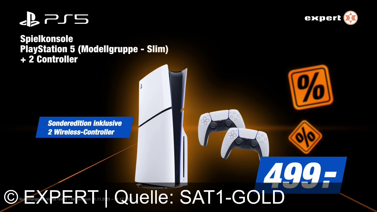 PlayStation 5 Slim mit 2 Controllern wird für 499 Euro angeboten. Text "Sonderedition inklusive 2 Wireless-Controller" und das Expert-Logo sind sichtbar. Zwei orangene Prozentzeichen heben das Angebot hervor. Gilt vom 21.11.2025 bis 01.12.2025, solange der Vorrat reicht.