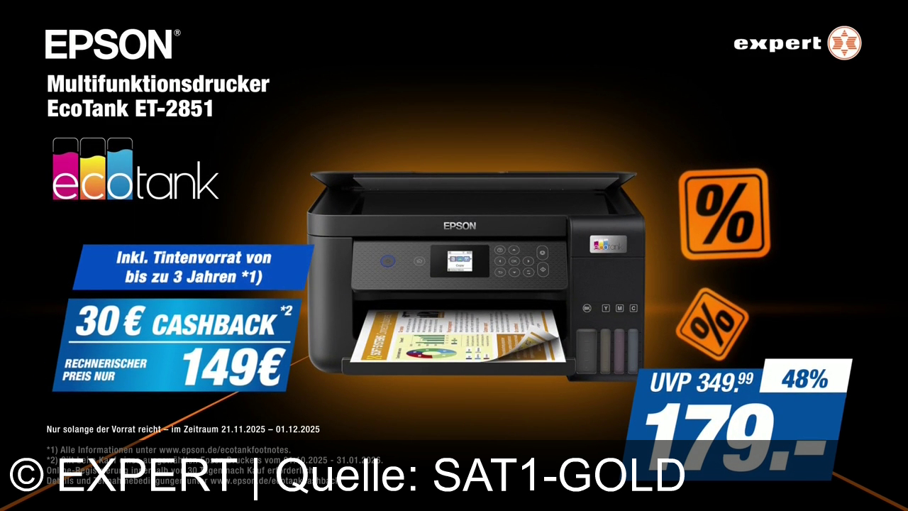 Epson Multifunktionsdrucker EcoTank ET-2851 abgebildet. Rechts orange % Symbole. Oben links Epson Logo, darunter „ecotank“. Text mit Infos: Tintenreichweite bis 3 Jahre, 30 € Cashback, Preis 149 €. UVP 349,99 €, Angebotspreis 179 €. Zeitraum: 21.11.2025 – 01.12.2025. Links oben „expert“ Logo. Informationen zum Cashback und Teilnahmebedingungen angegeben.