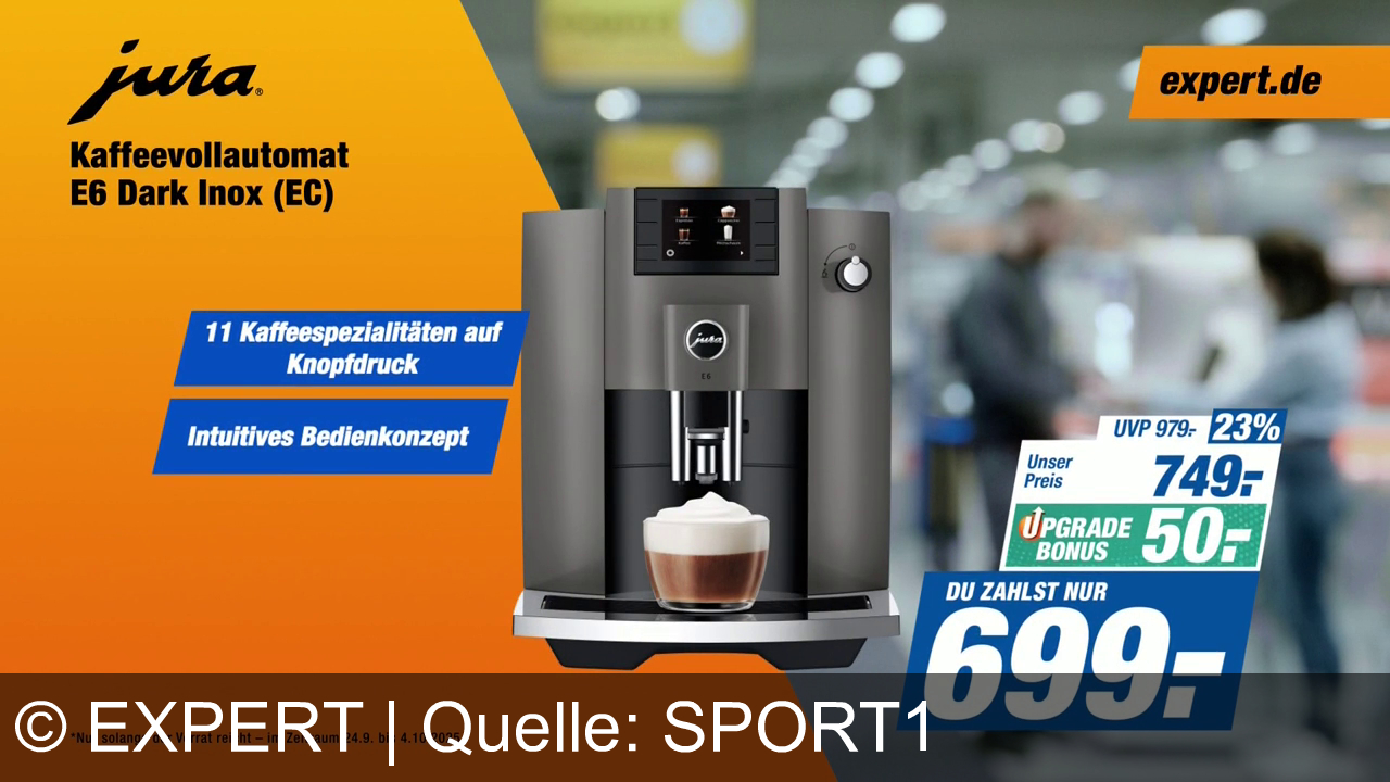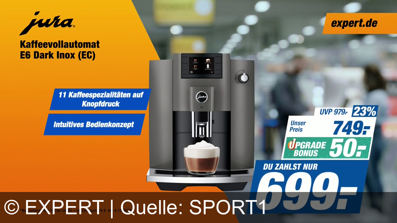 Kaffeevollautomat von Jura, Modell E6 Dark Inox, wird beworben. 11 Kaffeespezialitäten auf Knopfdruck und intuitives Bedienkonzept. UVP 979€, Preis reduziert um 23% auf 749€, mit Upgrade-Bonus von 50€ ergibt einen Endpreis von 699€. Werbeelement von expert.de im Hintergrund. Aktion gültig bis 4. Oktober 2025.