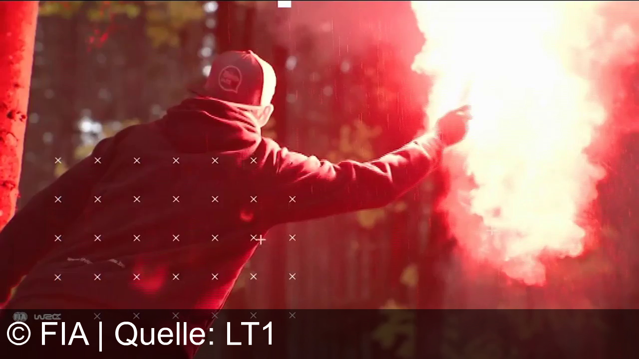 Person mit Kapuze und Baseballkappe hält eine rote Leuchtfackel in einer Hand. Rauch und helles Licht umgeben die Szene. Im Hintergrund sind Bäume zu erkennen. Links unten sind die Logos "FIA" und "WRC" sichtbar. Dünne weiße Kreuze sind über das Bild verstreut.
