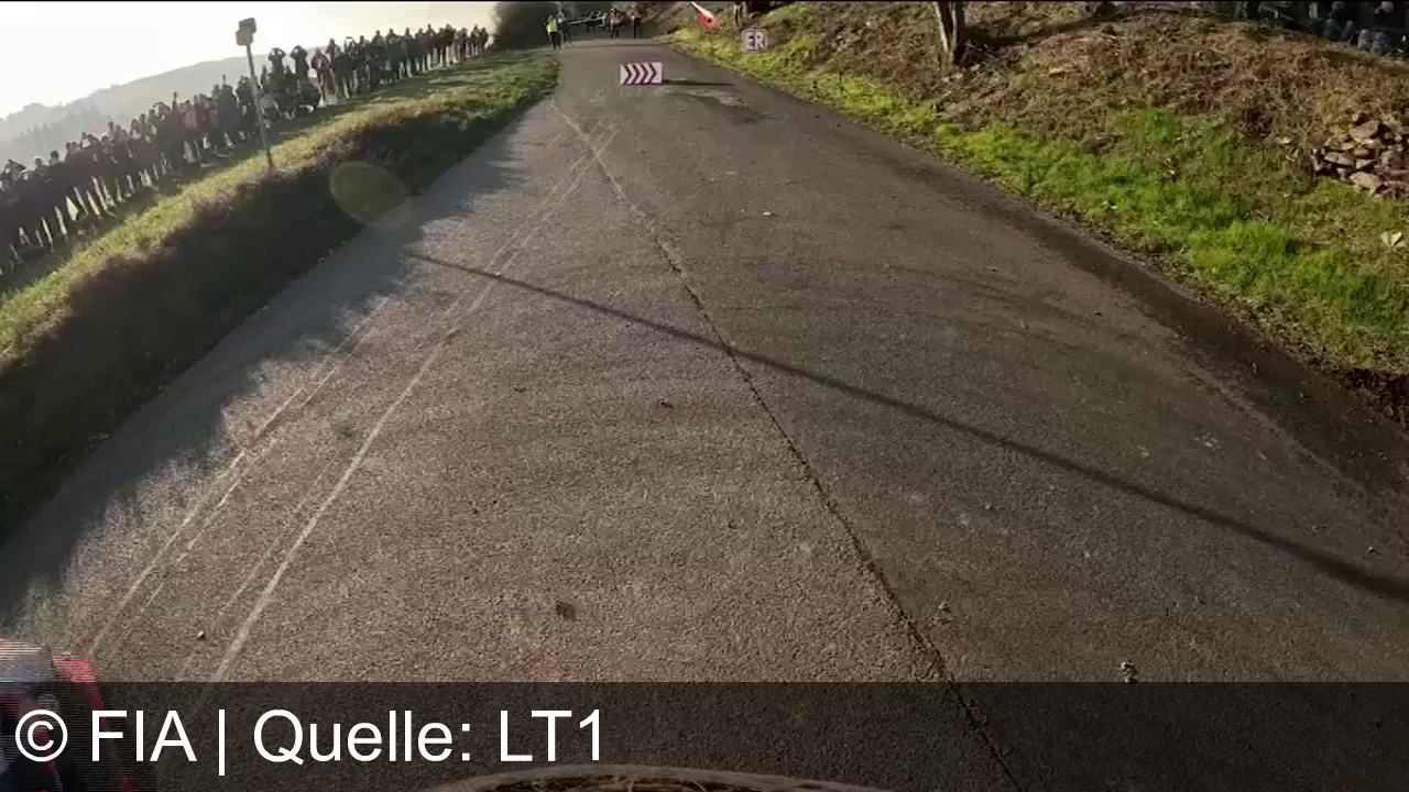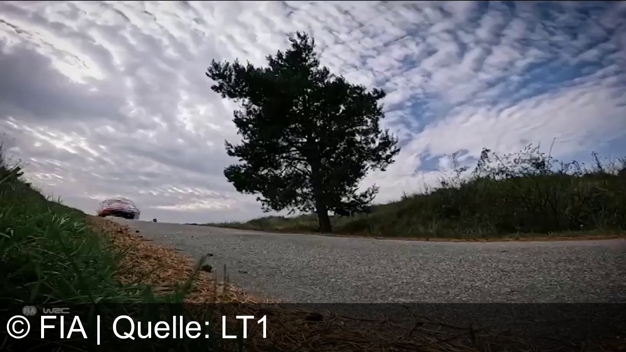 Eine ländliche Straße mit einem Baum rechts der Fahrbahn. Ein Auto fährt schnell links aus dem Bild heraus. Der Himmel ist wolkig, Gras am Straßenrand. Links unten befinden sich Logos von FIA und WRC.