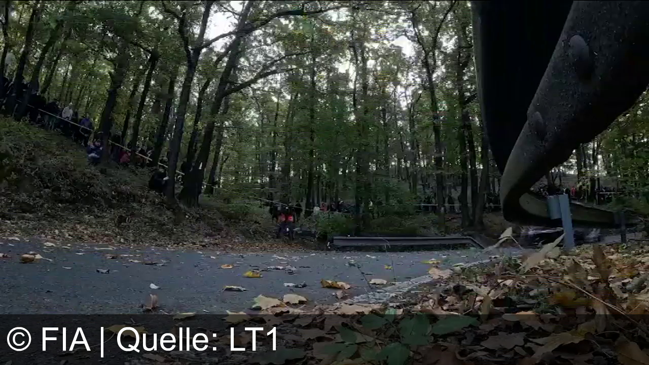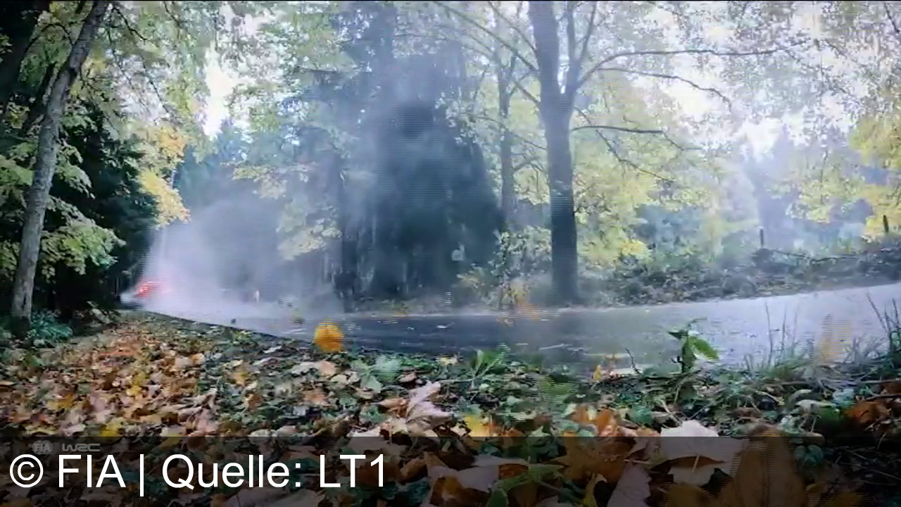 Ein rotes Rennfahrzeug rast durch einen Wald auf einer nassen Straße. Herbstlaub bedeckt den Boden. Nebel oder Rauch zieht hinter dem Auto her. Große Bäume stehen im Hintergrund. In der Ecke sind FIA und WRC Logos zu sehen.