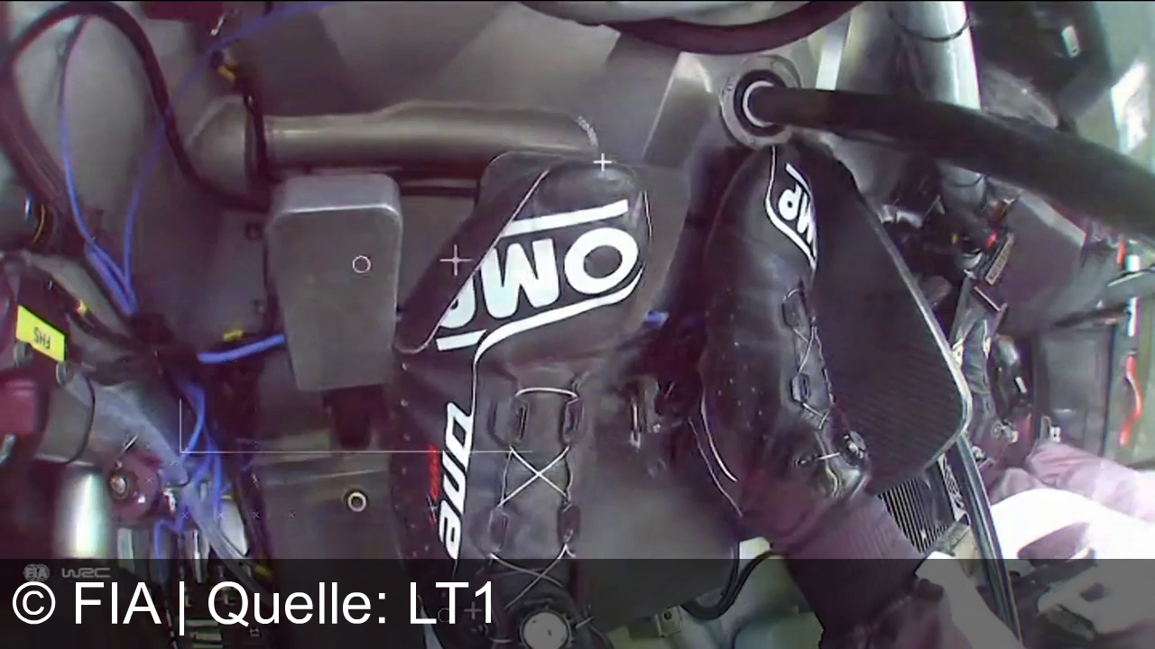 Ein Paar Füße in schwarzen Rennschuhen betätigt die Pedale in einem Autosport-Cockpit. Umgeben von technischen Elementen und Kabeln. Auf einem Schuh steht "OMP". Sportlich-technische Umgebung. Links unten das Logo von FIA und WRC.