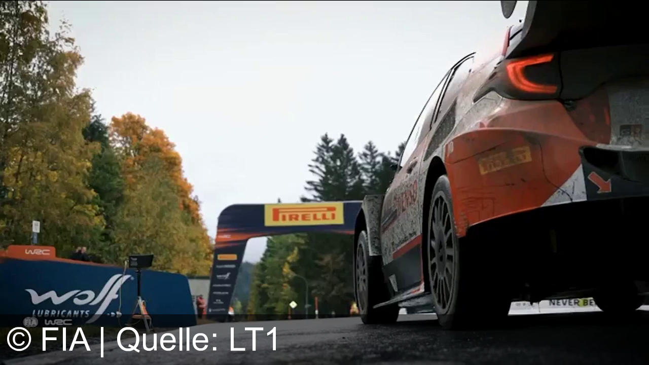 Ein Rallyeauto steht auf regennasser Straße. Im Hintergrund ein Startbogen mit Pirelli-Logo, umgeben von Herbstbäumen. Links Banner mit Wolf Lubricants und WRC-Logo. Ein Mann steht hinter dem Banner.