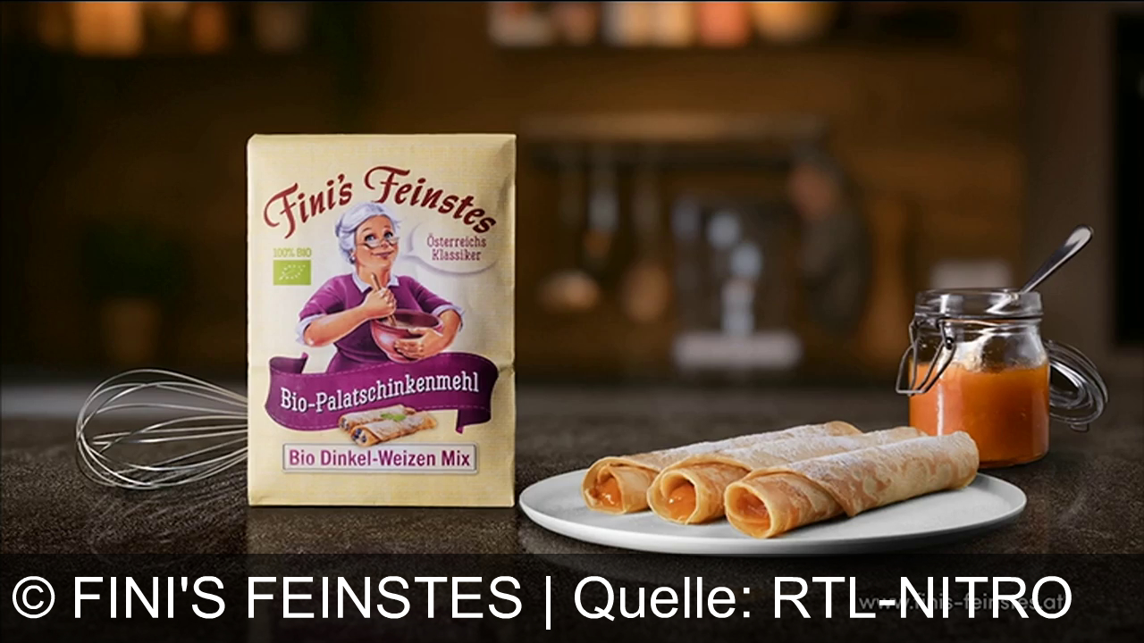 Eine Packung Mehl mit der Aufschrift "Fini's Feinstes Bio-Palatschinkenmehl" steht auf einem Küchentresen. Daneben ein Teller mit drei gerollten Palatschinken. Rechts ein Glas mit oranger Marmelade und einem Löffel. Im Hintergrund eine Küche mit unscharfen Utensilien. Unten rechts die Website "finis-feinstes.at".