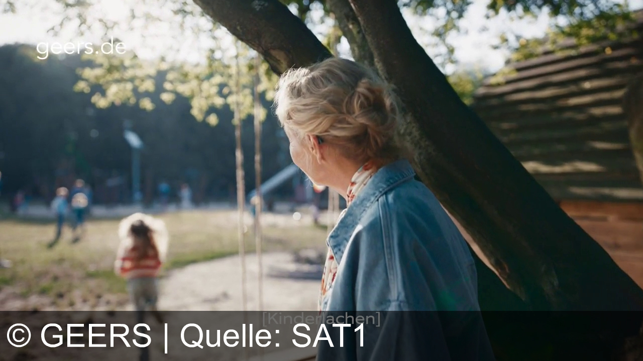 Eine Frau steht unter einem Baum und schaut auf einen Spielplatz. Kinder laufen im Hintergrund. Links oben ist die Webseite "geers.de" zu sehen. Die Untertitel zeigen "[Kinderlachen]". Die Szene wirkt hell und freundlich.