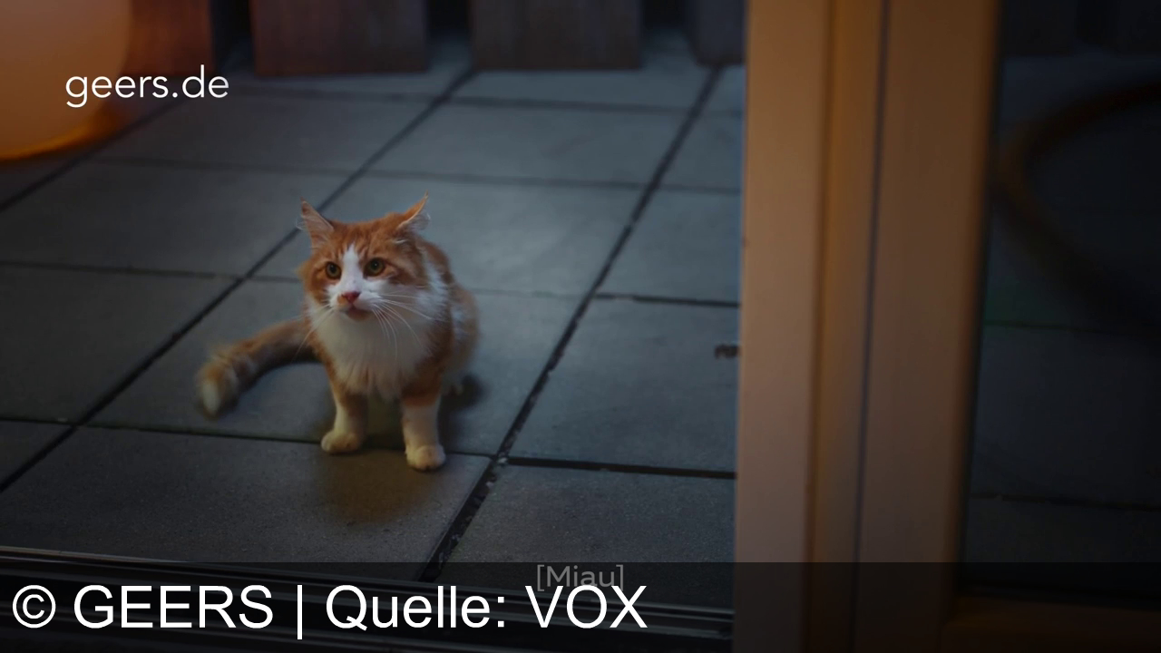 Eine Katze mit rot-weißem Fell sitzt draußen vor einer Glastür auf grauen Fliesen. Oben links steht "geers.de". Unten ist das Wort "[Miau]" eingeblendet.