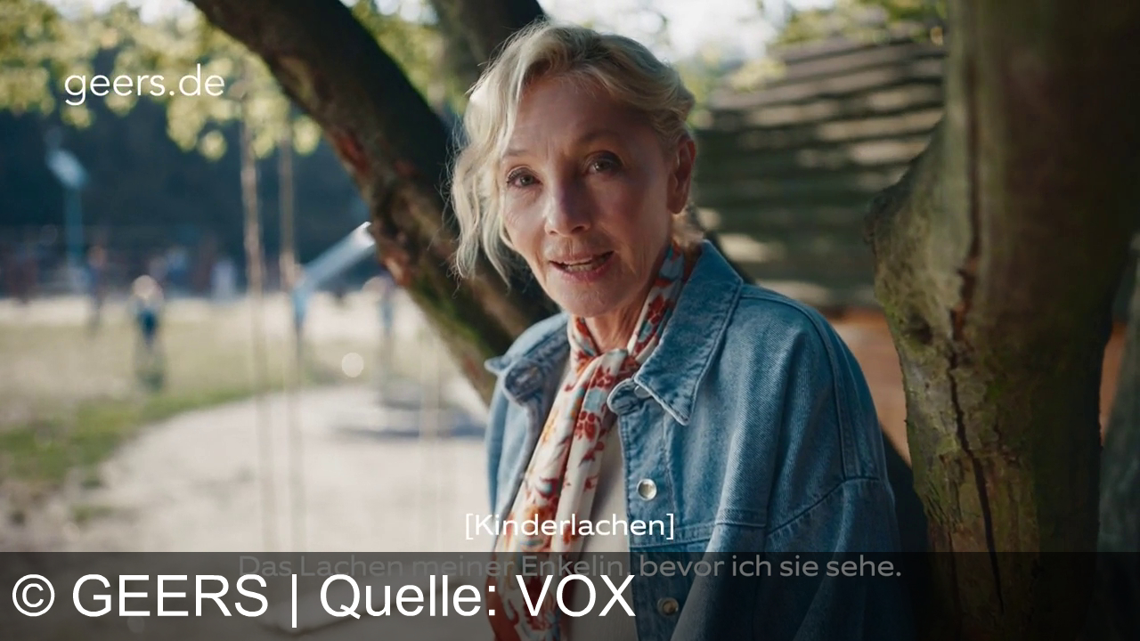 Eine Frau mit blonden Haaren und Jeansjacke steht draußen vor einem Baum. Im Hintergrund sind unscharf Kinder auf einem Spielplatz zu erkennen. Oben links steht "geers.de". Unten rechts im Bild steht der Text: "Das Lachen meiner Enkelin, bevor ich sie sehe." und in den eckigen Klammern "[Kinderlachen]".