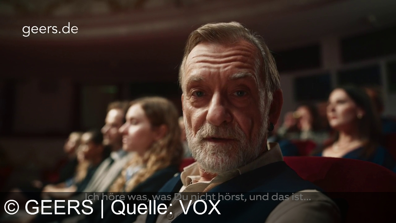 Ein älterer Mann sitzt in einem Theatersaal. Um ihn herum sitzen weitere Personen in roten Sitzreihen. Im Vordergrund steht der Text: "Ich höre was, was Du nicht hörst, und das ist..." Oben links ist der Schriftzug "geers.de" zu sehen. Die Beleuchtung ist gedimmt, typisch für ein Theater oder Kino.
