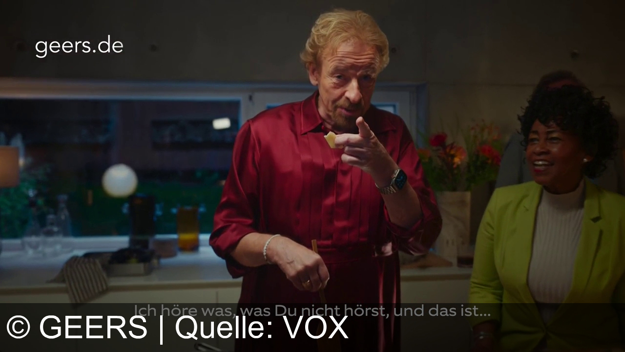 Ein älterer Mann in rotem Hemd zeigt mit dem Finger nach vorne und hält ein Stück Käse. Eine Frau neben ihm lacht. Im Hintergrund sind eine Küche und Fenster erkennbar. Der Text "geers.de" steht oben links. Unten im Bild steht der Satz: "Ich höre was, was Du nicht hörst, und das ist...".