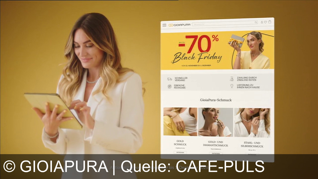 Werbung aus dem Jahr 2025 von Gioiapura in Österreich, mit dem von uns gewählten Titel: "Black Friday bei GioiaPura: Schmuck, Uhren & Accessoires von Top-Marken bis zu 70% reduziert" mit der Kurzbeschreibung: "GioiaPura: Black Friday! Bis zu 70% auf Schmuck, Ringe, Uhren und Accessoires von über 160 Top-Brands. Große Freude zu kleinen Preisen – jetzt auf GioiaPura.at!". Diese Werbung thematisiert oder beinhaltet die Kategorien Schmuck, Uhren, Geschenk, Halskette, Ohrringe, Rabatt.
