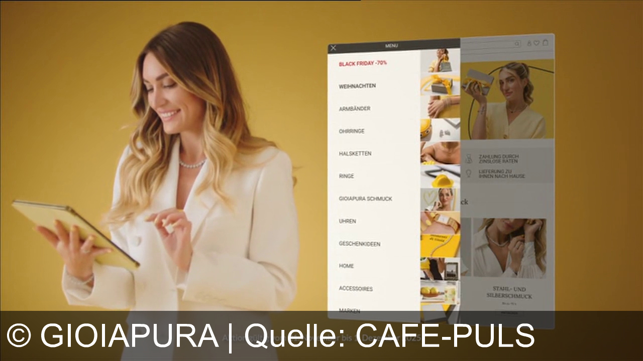 Eine Frau in einem weißen Blazer tippt auf ein Tablet. Daneben ein digitales Menü mit Kategorien wie "Weihnachten", "Armbänder", und "Ohrringe". Oben steht "Black Friday -70%". Hintergrund in Gelb. Unten ein Hinweis: Aktion gültig vom 21. November bis 1. Dezember 2025.
