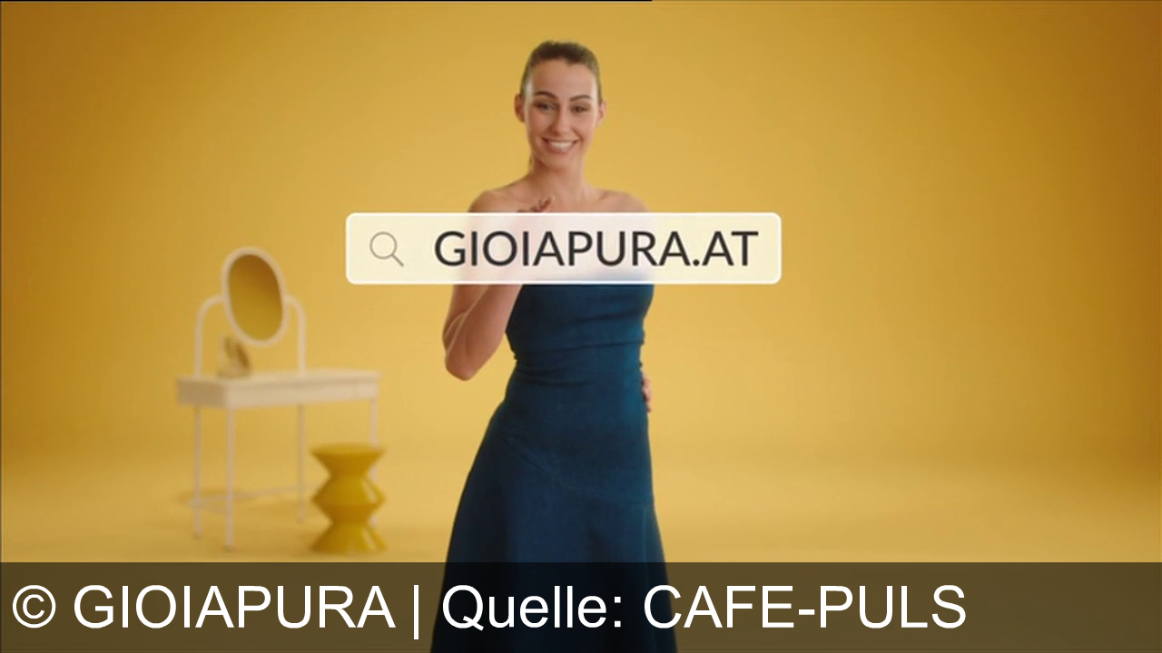 Eine Frau in einem blauen Kleid steht vor einem gelben Hintergrund. Sie lächelt in die Kamera und zeigt auf ein Suchfeld mit der URL "GIOIAPURA.AT". Im Hintergrund ein weißer Schminktisch mit Spiegel und ein gelber Hocker.