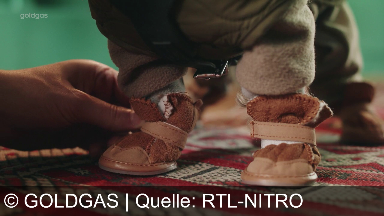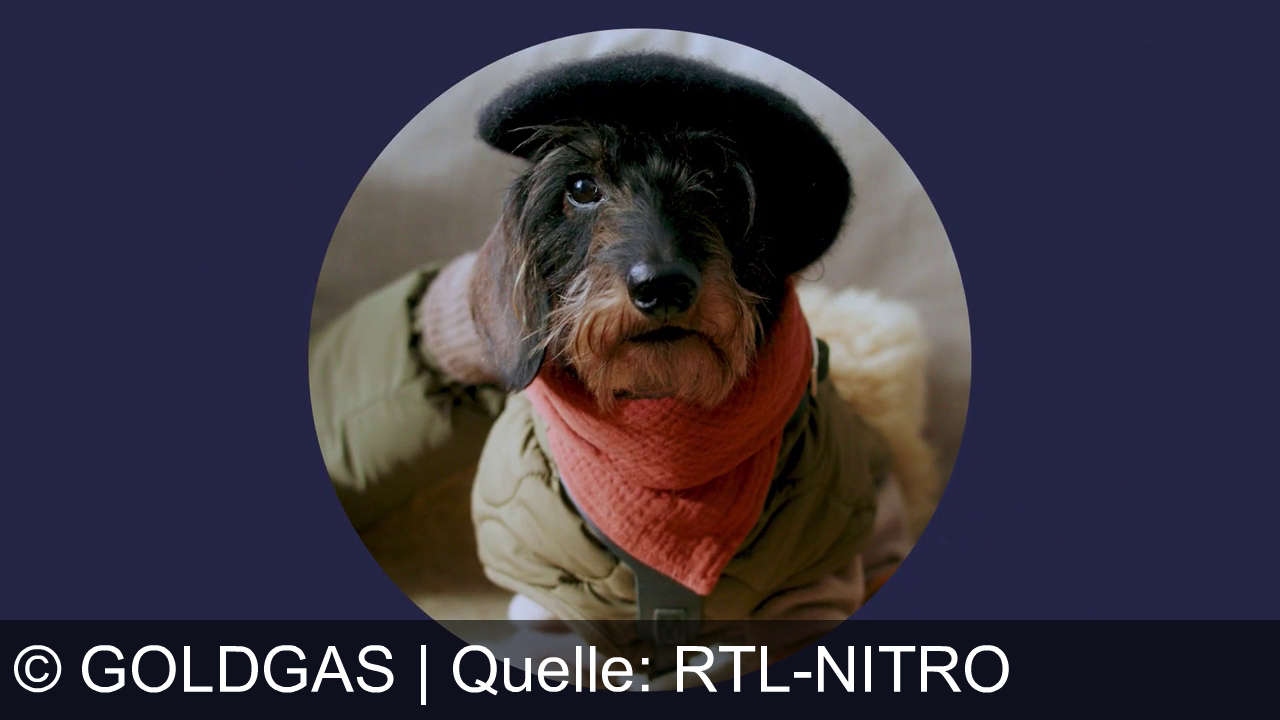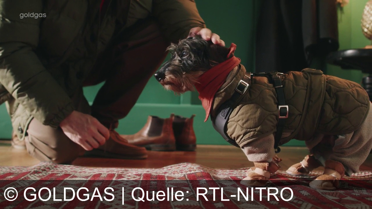 Ein kleiner Hund trägt eine Jacke, Halstuch und Stiefel. Eine Person hockt neben dem Hund und streichelt ihn. Auf dem Boden liegt ein Teppich und im Hintergrund stehen ein Paar braune Schuhe. Die Szene spielt in einem Raum mit grüner Wand. Oben links steht "goldgas".
