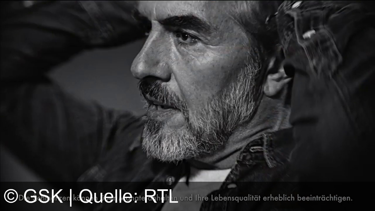 Ein schwarz-weiß Bild zeigt einen älteren Mann mit Bart. Er hält eine Hand an seinen Kopf. Unten im Bild steht der Text: „Die Schmerzen können über Monate anhalten und Ihre Lebensqualität erheblich beeinträchtigen.“