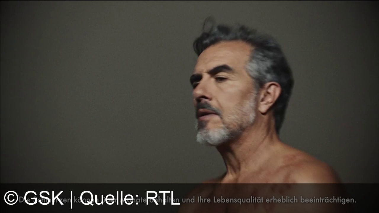 Ein Mann mit grauem Haar und Bart ist oberkörperfrei zu sehen. Er blickt zur Seite. Der Hintergrund ist schlicht und grau. Unten im Bild steht der Text: "Die Schmerzen können über Monate anhalten und Ihre Lebensqualität erheblich beeinträchtigen."