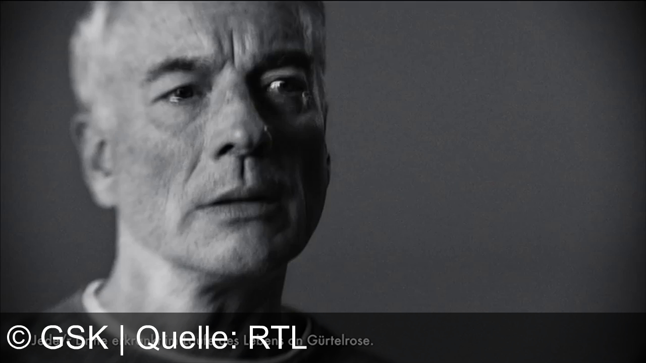 Ein Mann mit ernster Miene, schwarz-weiß dargestellt, schaut zur Seite. Unten im Bild steht der Text: "Jede/r Dritte erkrankt im Laufe des Lebens an Gürtelrose."