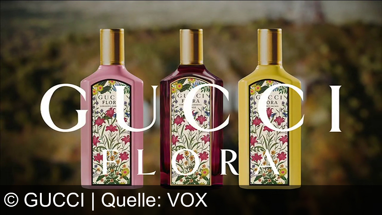 Drei bunte Parfümflaschen mit floralem Design stehen nebeneinander. Jede Flasche hat einen goldenen Verschluss. Auf den Flaschen steht "GUCCI FLORA". Der Hintergrund ist unscharf, wahrscheinlich eine Naturlandschaft. Große weiße Buchstaben überlappen die Flaschen, die das Wort "GUCCI" bilden.