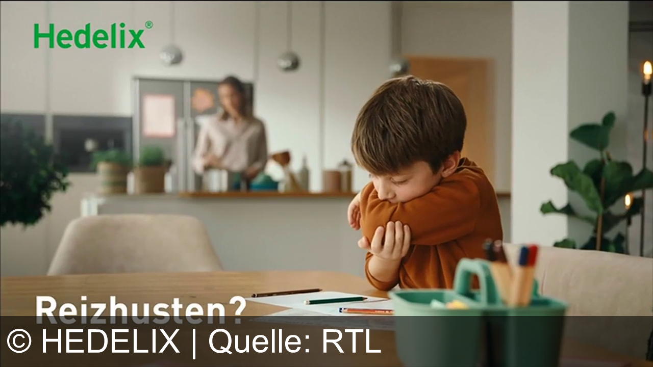 Ein Junge in einem braunen Pullover hustet in seinen Arm an einem Tisch. Auf dem Tisch liegen Buntstifte und Papier. Im Hintergrund steht eine Frau in der Küche. Der Text „Reizhusten?“ ist eingeblendet. Oben links steht "Hedelix". Im Raum sind Pflanzen und moderne Leuchten sichtbar.