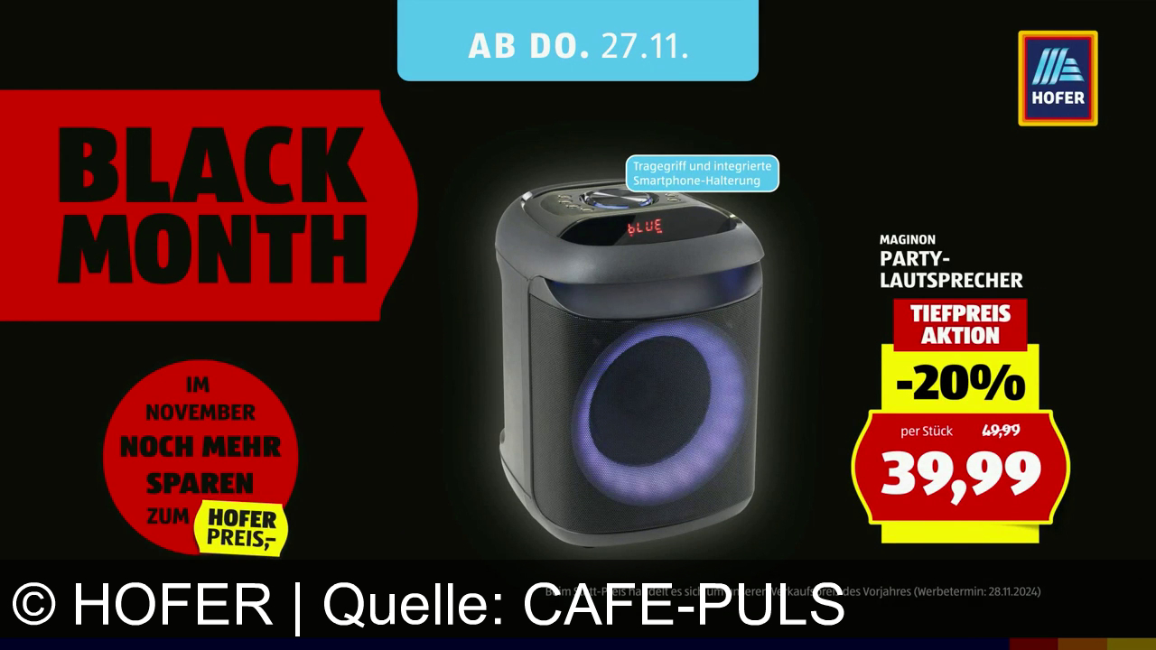"Black Month" bei Hofer. Start ab 27.11. Maginon Party-Lautsprecher für 39,99 Euro, vorher 49,99 Euro, mit 20% Rabatt. Tragbarer Lautsprecher mit blauer LED und Smartphone-Halterung. Schrift in Rot, Gelb und Blau. Angebot gilt im November. Hofer-Logo oben rechts.