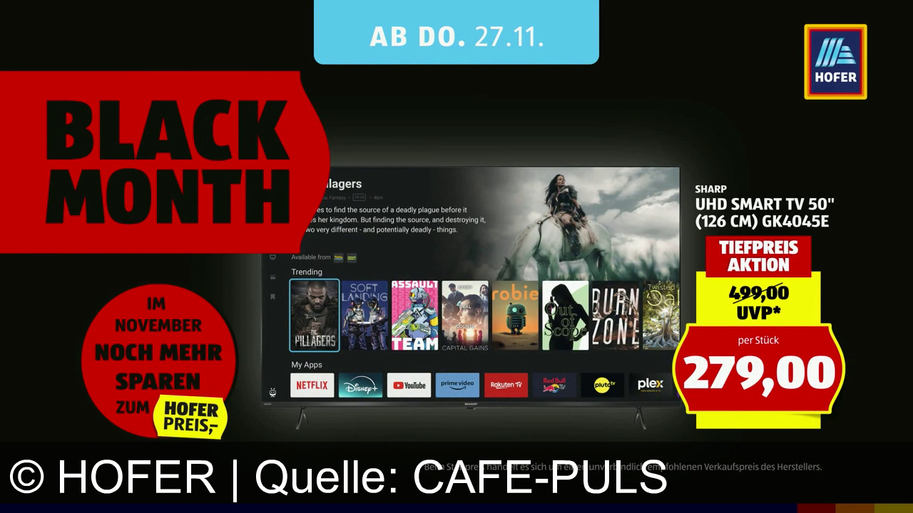 "Black Month" und "Tiefpreis Aktion" mit Fokus auf einen Sharp UHD Smart TV 50" für 279 Euro statt 499 Euro. "Ab Do. 27.11." oben in Blau. Verschiedene Streaming-Apps wie Netflix und YouTube auf dem Display. Text: "Im November noch mehr sparen zum Hofer Preis." Hofer-Logo rechts oben.