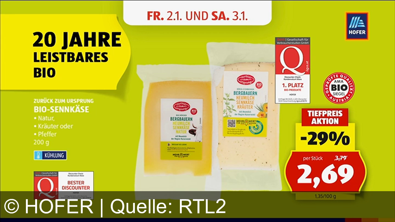 Werbung aus dem Jahr 2026 von Hofer in Österreich, mit dem von uns gewählten Titel: "Hofer feiert 20 Jahre Zurück zum Ursprung: Bio-Sennkäse jetzt zum Jubiläumspreis von 2,69 €" mit der Kurzbeschreibung: "Feiere 20 Jahre Zurück zum Ursprung bei HOFER – nachhaltige Bio-Qualität, Jubiläumsangebote und Genuss für die ganze Familie. Bio-Sennkäse jetzt um nur 2,69 Euro! Da bin ich mir sicher.". Diese Werbung thematisiert oder beinhaltet die Kategorien Bioprodukte, Käse, Lebensmittel, Supermarkt, Rabatt.
