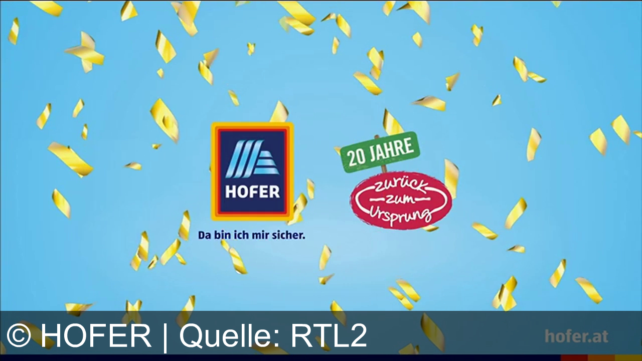 Ein blaues Hintergrundbild mit gelben Konfettis. Mittig links das Hofer-Logo mit dem Slogan "Da bin ich mir sicher." Rechts davon ein ovales Logo mit "20 Jahre zurück zum Ursprung". Unten rechts die Website hofer.at.