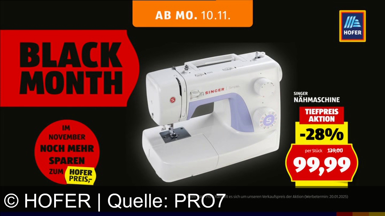Im Black Month bietet Hofer ab 10.11. den Ambiano Polster-Teppichreiniger für 49,99 € und die Singer Nähmaschine für 99,99 € an. Jede Woche gibt es neue Non-Food-Angebote. Werbeaussage: Im November besonders günstig bei Hofer einkaufen – „Da bin ich mir sicher.“