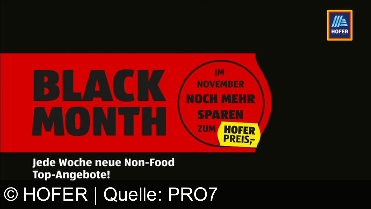 Schwarzer Hintergrund mit rotem Banner: "Black Month". Text: "Im November noch mehr sparen zum Hofer Preis". Unten: "Jede Woche neue Non-Food Top-Angebote!". Oben rechts das Hofer-Logo.