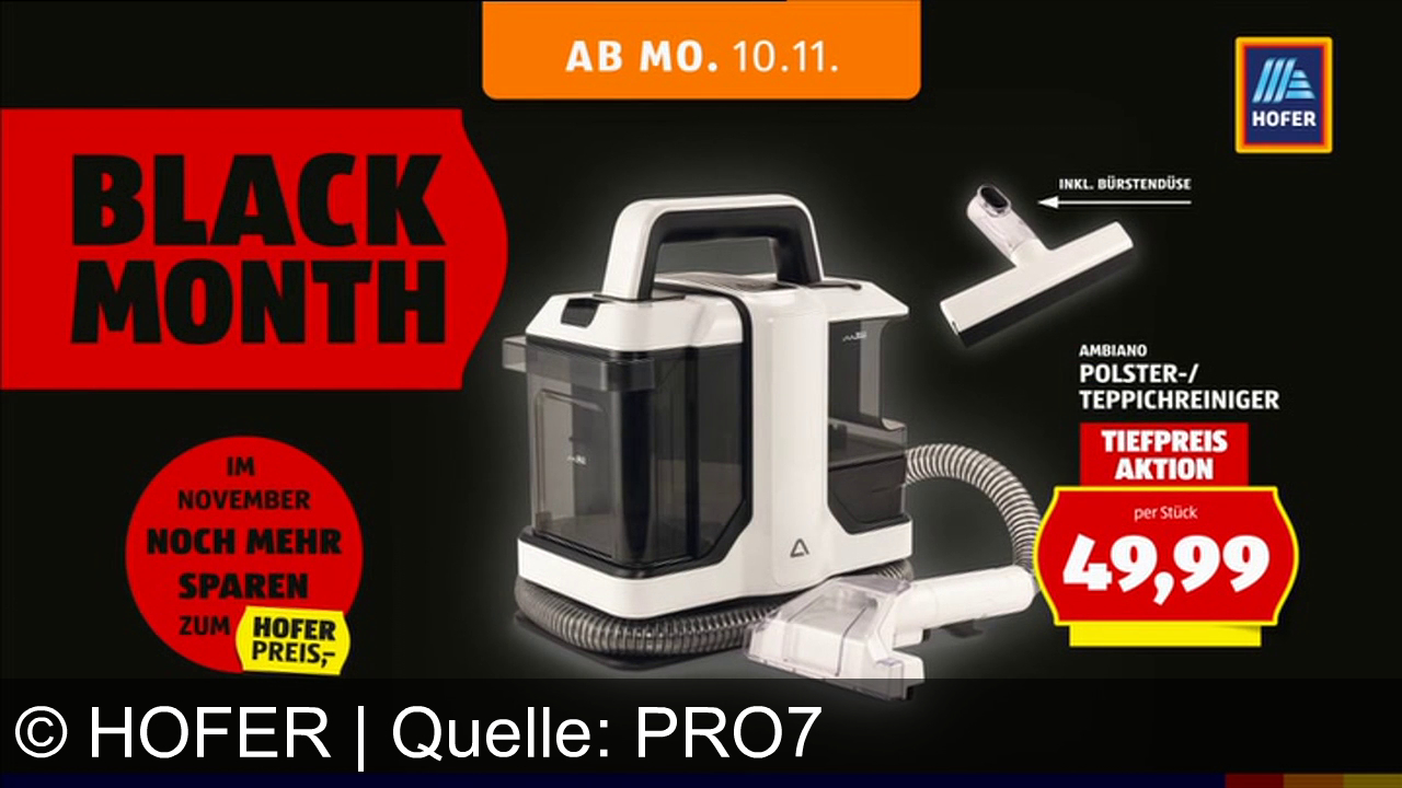 Eine Werbung mit einem Polster-/Teppichreiniger von Ambiano für 49,99 Euro. Ab 10.11. erhältlich. Text: "Black Month" und "Im November noch mehr sparen zum Hofer Preis". Links oben wird "Hofer" angezeigt. Der Reiniger kommt mit Bürstendüse. Logo und Farben betonen den Rabatt.